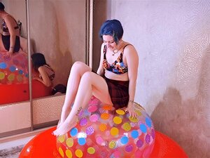 Q689 Stasia pumps 48'' beach ball under her to pop - 1080p. Silent pump is inflating big clear polka dotted beachball under stashia. she's excited with a feeling of vinil getting tighter under her and lifting her up! stashia keeps on rubbing and bouncing on that ball until it gets huge and finally pops under her!