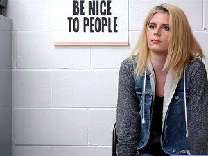 Shy blonde cutie shoplifter Blair Williams with small tits lured in to rough sex by a dirty LP officer after the interrogation in the backroom she had to suck and fuck his big dick on CCTV to get back her freedom