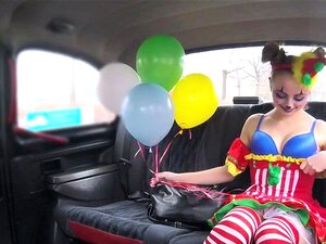 Clown babe squirts and fucks in fake taxi. Clown babe flashes boobs in bra and arse in fake taxi then driver fingers and fucks her squirting pussy in back seat pov in hidden place