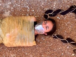 Special Delivery For The Rich Girl (wmv). Khloe, a rich woman, has ordered a girl, barby luna, to toy with, and franco, a 'special deliveries' guy, arrives to deliver barby to khloe. barby is mummified, tape gagged, and blindfolded, and she is tied to a box mover. the delivery man drives the box mover with barby on towards the front door. he knocks on the door and waits for someone to open while barby is making muffled noises through her gag since she has no idea what is going on and why. the rich girl, khloe, opens and she is surprised and happy about her special delivery. she shares her excitement with franco and asks him to drive the mummified girl to the backyard. the delivery guy brings barby to her final destination at the back of the house, where khloe awaits. khloe peels the tape gag off barby's mouth and takes her mouth stuffing out. the stuffing is a crumpled piece of paper protected in a plastic bag from getting wet from barby's saliva. franco, the delivery man, handgags barby as khloe unfolds the paper and reads a note written on it: dear khloe, i hope you enjoy your gift! it says (in spanish)khloe asks franco to stay and help her for some time. she gives franco a pair of her dirty undies and asks him to gag barby with them for her. franco stuffs the panties deep in barby's mouth and wraps clear packing tape around barby's head as a tight gag.franco cuts the mummified girl loose from the box mover, puts her on the ground and says farewell to khloe. khloe then ties two pieces of rope around each of barby's pigtails hair, hammers a stake stefar away from barby's head, and ties the rope tied around her pigtails to the stakes to pull barby's hair. khloe ties barby's big toes together with a shoelace as tight as possible and hammers another stake south of barby's bare feet deep into the ground. she ties barbie's tied toes to the stake so that she is pulled at the top (with her hair tied) and from the bottom with her toes tied.khloe stands above barby in her high stilettos and her beautiful dress in a dominant way and looks down on the gagged girl lying all stuck and helpless in mummification bondage on the ground. she bows down to barby and says i hope you like the taste of my dirty panties! (in spanish).khloe puts silver duct tape over barby's clear tape gag in a butterfly shape so we can no longer see the clear tape wrapped over her panty-stuffed mouth. khloe stands superiorly above barby and looks down on her while laughing and making dominant comments. she also puts her high stilettos close to barby's face to show supremacy and dominance. she gives the mummified girl a big wet kiss on her tape gag and leaves her to struggle!included in this clip: mummification bondage, outdoors, lesbian bondage, tape gagged, domination, humiliation, panty gagged, mouth stuffing, wraparound tape gag, hair tied, tied toes, gag talk, tape bondage, bdsmdialogue in spanishyou may also like: laura & maria in: ball tied latina transported away on a box mover by a greedy catsuit burglar!