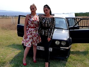 34 - Ann and Julia problem with old BMW. It's sunny day and ann with julia wanna test the old bmw after long time. 1st ann started and give some revs but car suddenly stop so she try to cranking how will start up again. seems she didn't know so jula ask her to give her a try. she cranking it also but car didn't start. finaly when car started she give some good revving to check is it everything fine. ann wearing skirt with nylon pantyhose and red heels and julia pants with black high heels shoes.