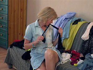 Mature busty lady in sheer slip strips