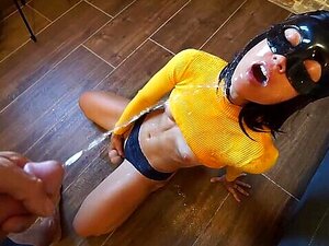 Golden shower for masked chick. Couple is having fun just making sex. The girl is fingered, it makes her so wet. She gives blowjob and masturbate with dildo while the guy makes golden shower on her face.