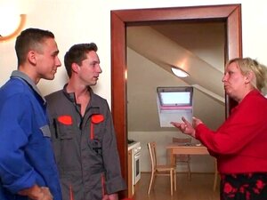 Very old blond granny pleases 2 workers