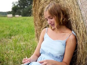 Oxana was hanging out in the hay field writing in her